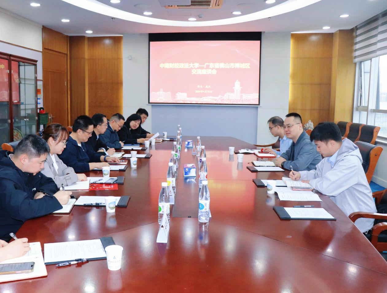 佛山市禅城区来校交流座谈 发布时间:2026-04-17 访问次数:10 (通讯员 郭青川)4月16日上午,广东省佛山市禅城区代表团到访中南财经政法大学,双方在南湖校区中原楼六楼会议室举行交流座谈。会上,双方围绕共建技术转移中心、形成供需清单、精准对接禅城区产业需求、推动产学研合作落地见效等议题进行了深入交流,并达成初步共识。双方表示,将以此次座谈为契机,进一步深化校地合作,促进科技成果转化与人才对接。佛山市禅城区及学校相关单位负责人参加座谈。