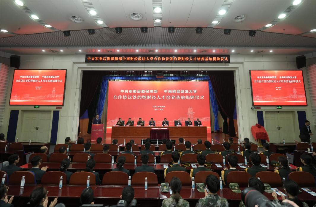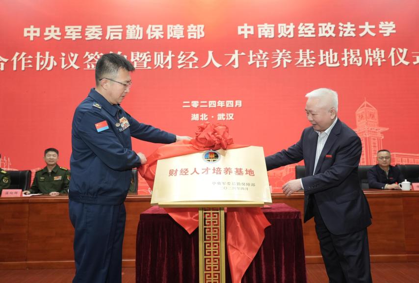 新闻网讯(通讯员 张亚星)4月8日,学校与中央军委后勤保障部合作协议签署暨“财经人才培养基地”揭牌仪式在文泉楼报告厅举行。军委后勤保障部政治工作局领导,党委书记侯振发,校长、党委副书记杨灿明,党委副书记陈狮,副校长覃红等出席仪式,军委后勤保障部官兵代表、学校相关单位党政负责人和部分师生代表参会。