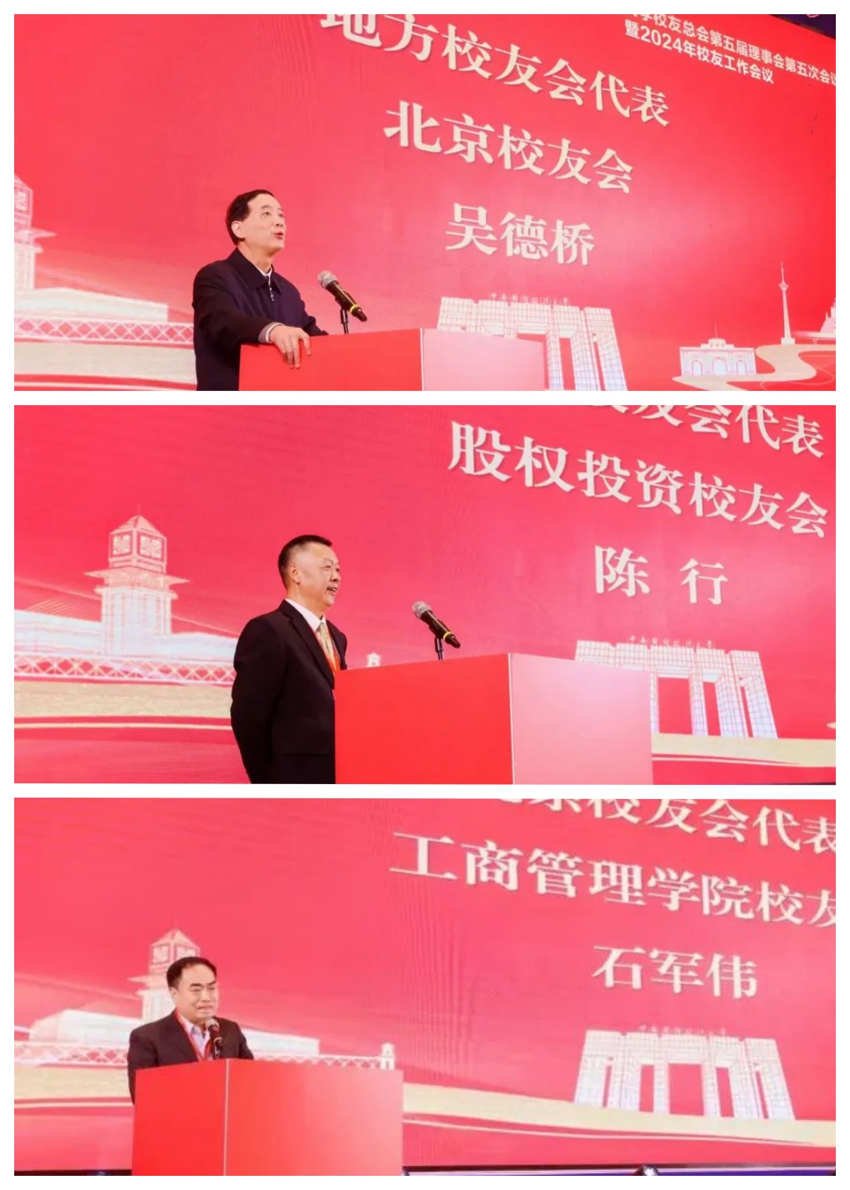 地方校友会、行业校友会与院系校友会代表分别进行了主旨报告。北京校友会会长吴德桥强调校友会要通过丰富的活动和专业能力建设,搭建校友间资源共享和合作平台,以构建情感、事业和发展战略共同体。股权投资校友会理事长陈行介绍了行业校友会工作模式,提议校友们要带头捐资助力母校发展建设,学校要更加关心校友需要,真正实现校友与母校共成长;工商管理学院副院长石军伟重点围绕学院校友会在凝聚校友力量推动学院发展,增强母校影响力方面分享了工作心得。
